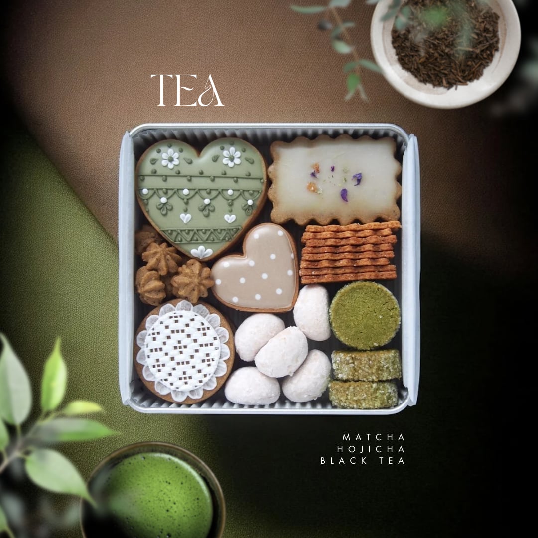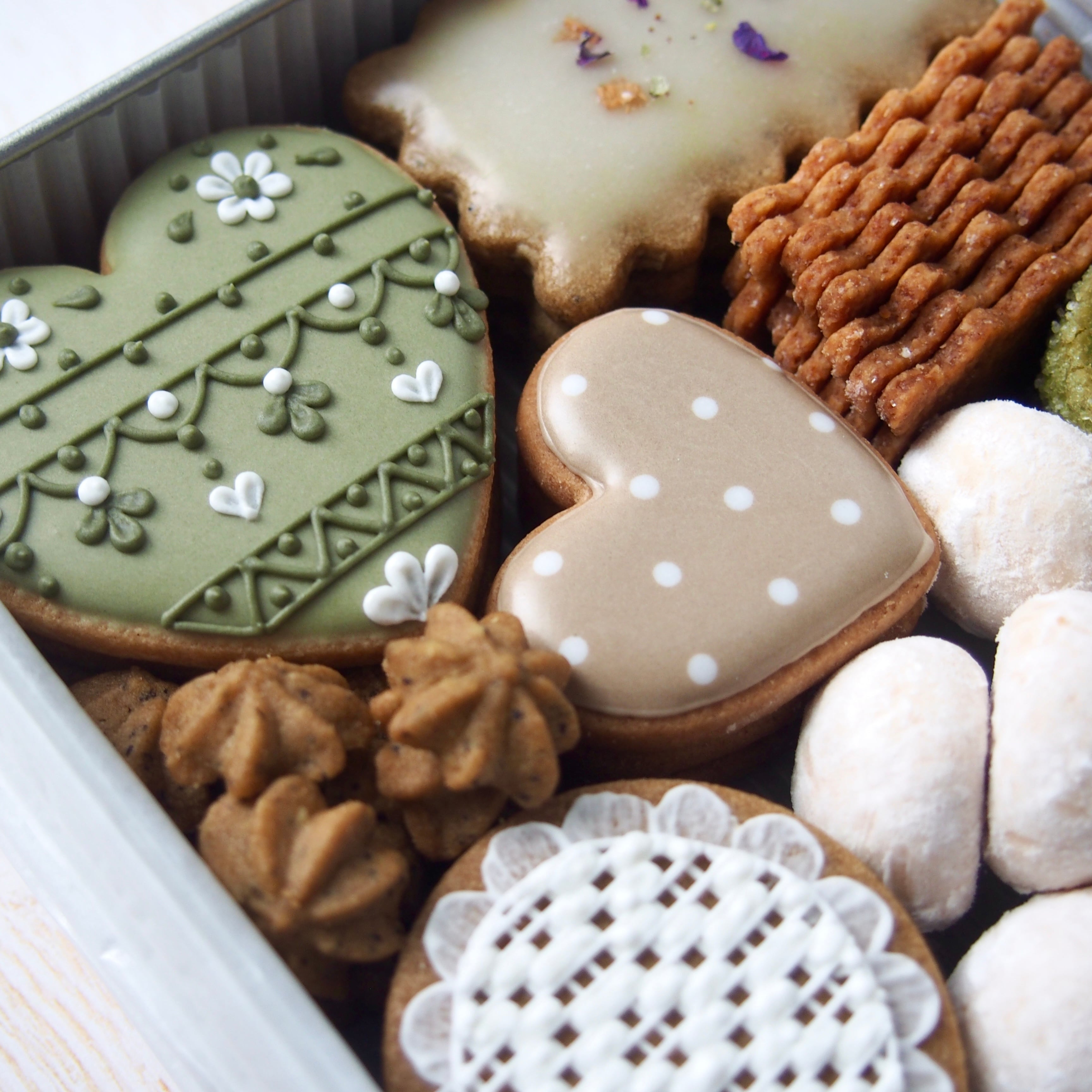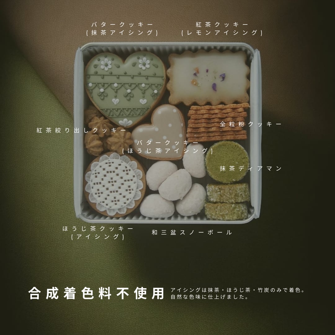 アイシングは抹茶・ほうじ茶・竹炭の濃淡のみで表現し、合成着色料不使用の優しい色味に仕上げました.